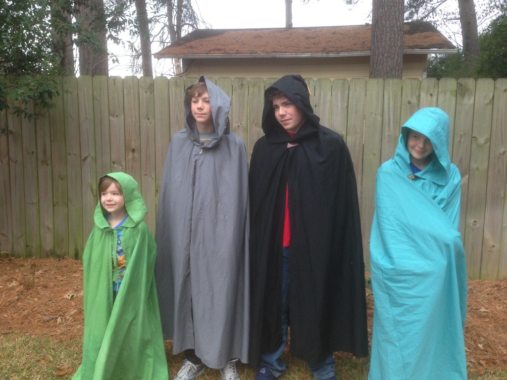 Linda surprised us by pulling out a bag with a handmade cloak-( she is famous for making these cloaks, people)- for each of our kids.