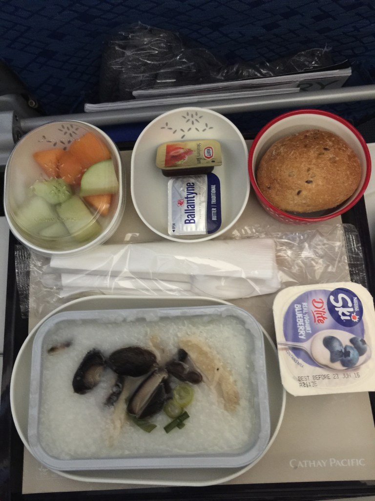 After our 3:30 am start, I could scarcely believe we were actually boarding Cathay Pacific only 10 minutes later that the scheduled departure time. No tornados or other things to delay us for 2 1/2 days…. So far at least.