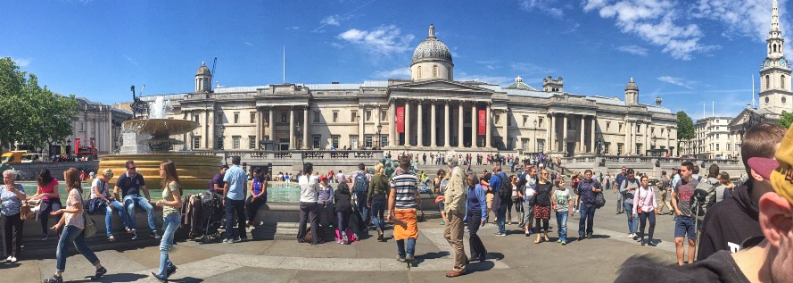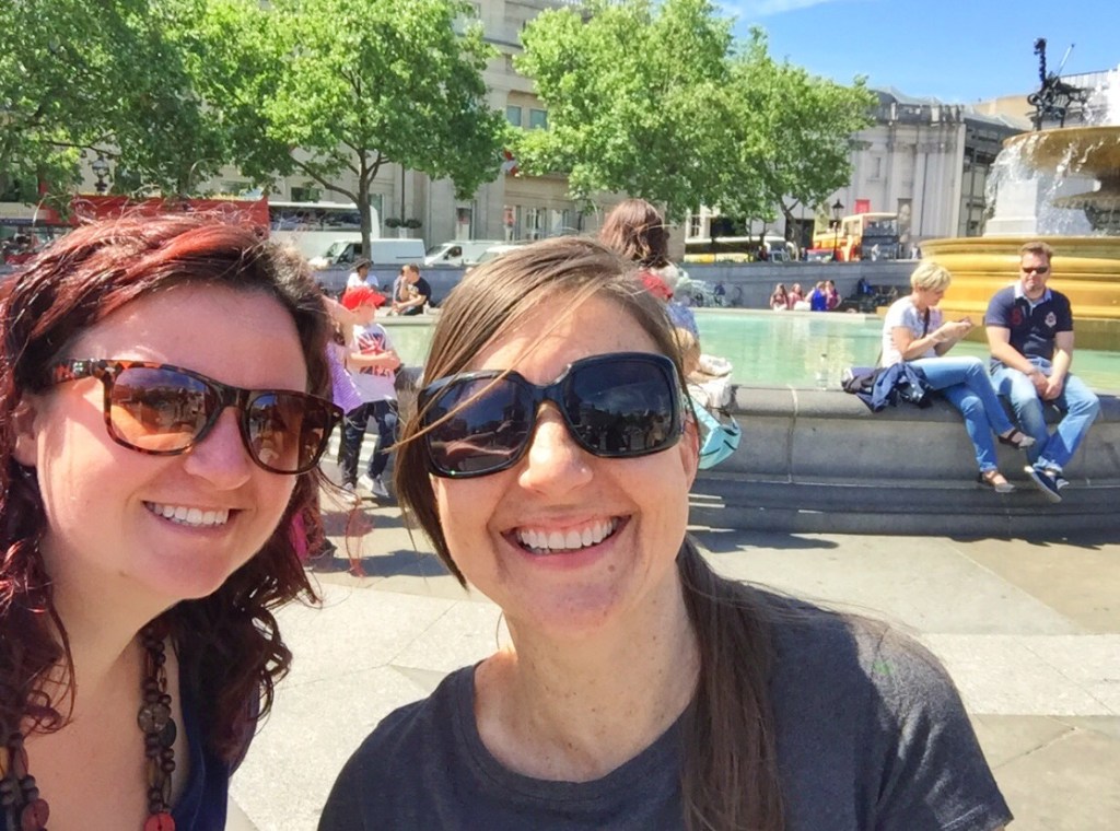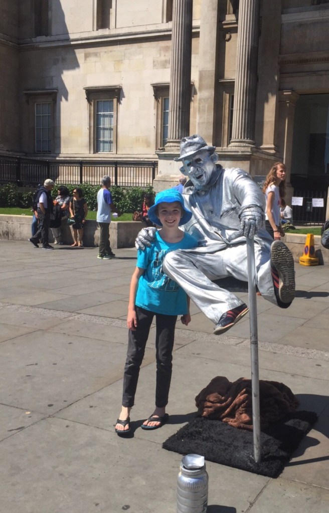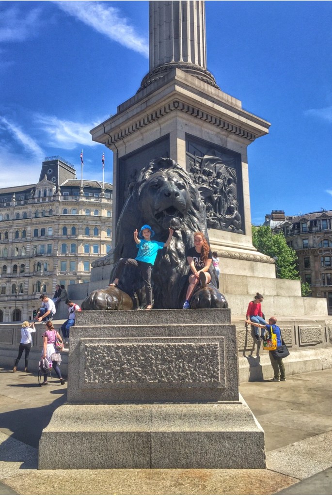 There are so many things to see in Trafalgar Square. Entertainers (who looked to be sweltering in the summery weather), buskers, and hordes of tourists. Nicole warned us that a woman was badly injured falling from a Trafalgar lion recently so we stuck to the safe pose.