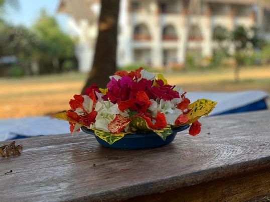 I noticed yesterday, amongst all the same/same deck chairs stretched out under the cabanas that one stood out. It is secluded. Next to it is set a little table. On the table lies a wide, shallow dish full of vibrant exotic flowers, a small framed photo or mirror and a fancy bag.