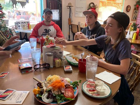 The waitress was lovely. The guys ordered buffalo burgers, Kara got loaded fries, Flynn got nuggets and a hit chocolate and I ordered the Chef’s salad with blue dressing.