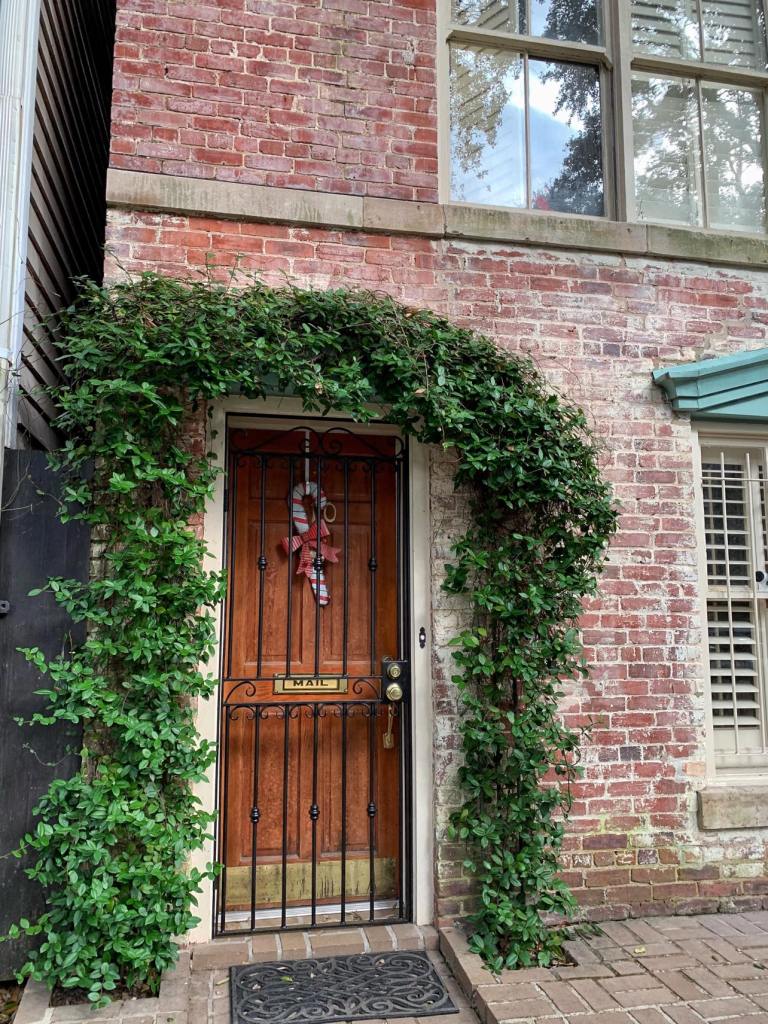 Meandering slowly along both sides of the street, I took in only half of Jones St, leaving the other half to discover and savor with the rest of the family. Nearly every door bore a massive Christmas wreath, many had fresh evergreens wound around their staircase’s balustrade, some with Christmas lights intertwined. My favorites were the ones with a US flag sticking out at an angle.