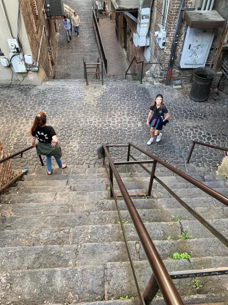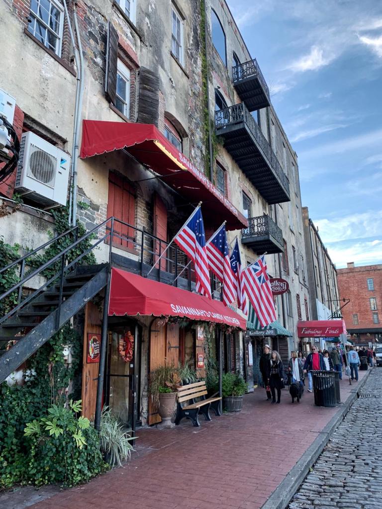 River St is a pretty, cobblestoned street for pedestrians ( and the odd car here and there) alongside the Savannah River. There are 2 steep sets of steps to get down to the river with signs telling us that, as historic steps, we take them at our own risk.