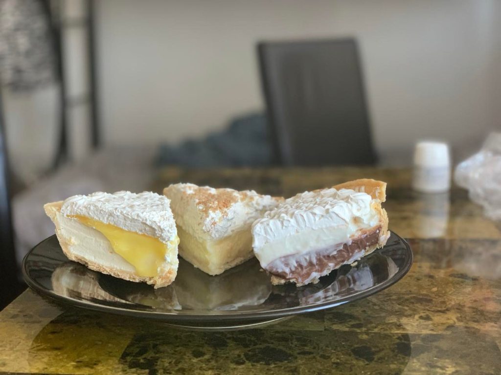 While at the store I saw that one of the food places I had noted for us up visit (Ted’s Bakery) supplied individual slices of their most famous pies there. I bought one of each: haupa cream ( coconut), chocolate cream and lilikoi cheese( which was like a passion fruit -topped cheesecake). All were yummy but my favorite was the lilikoi.