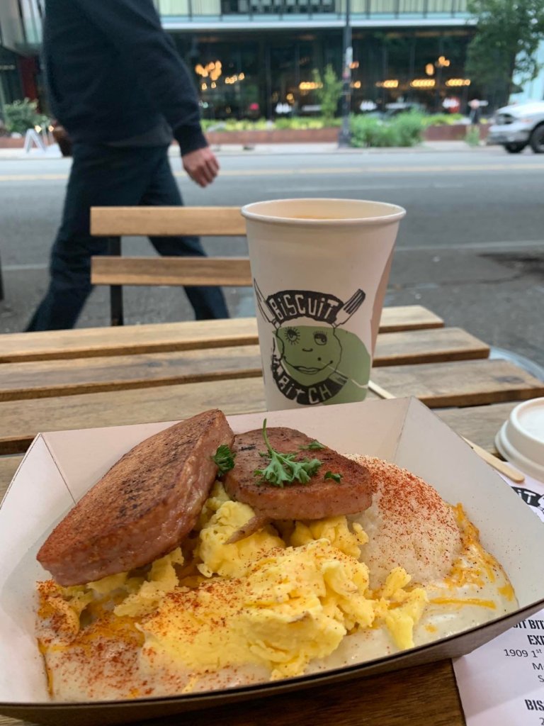 I ordered the cheesy scrambled b%*#&h and added spam, duh.Trying not to blush every time a new patron walks through the door and is greeted with a cheery ‘What’s up b%*#&hes!’