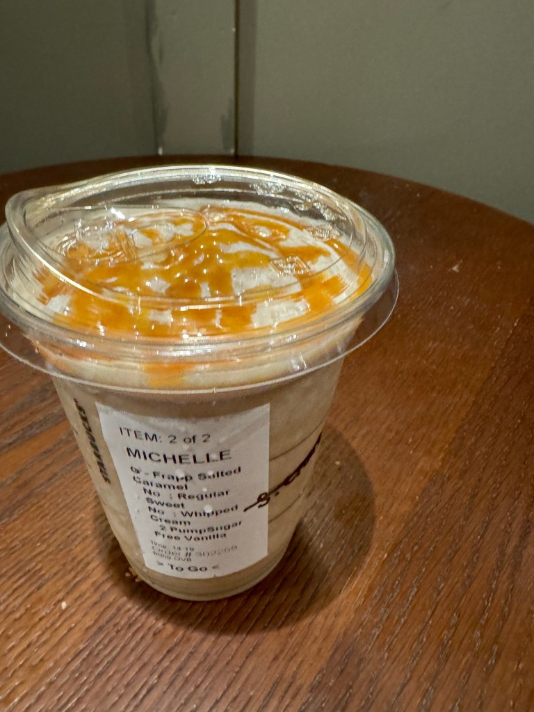 I learned a few tweaks to Starbucks drinks off TikTok. Because I can’t do sugar, I still wanted to enjoy something fun. I don’t think they have anything pumpkin flavoured here. I will try tomorrow. I ordered a no- sugar salted caramel frappe on a double shot with 2 pumps of sugar-free vanilla
