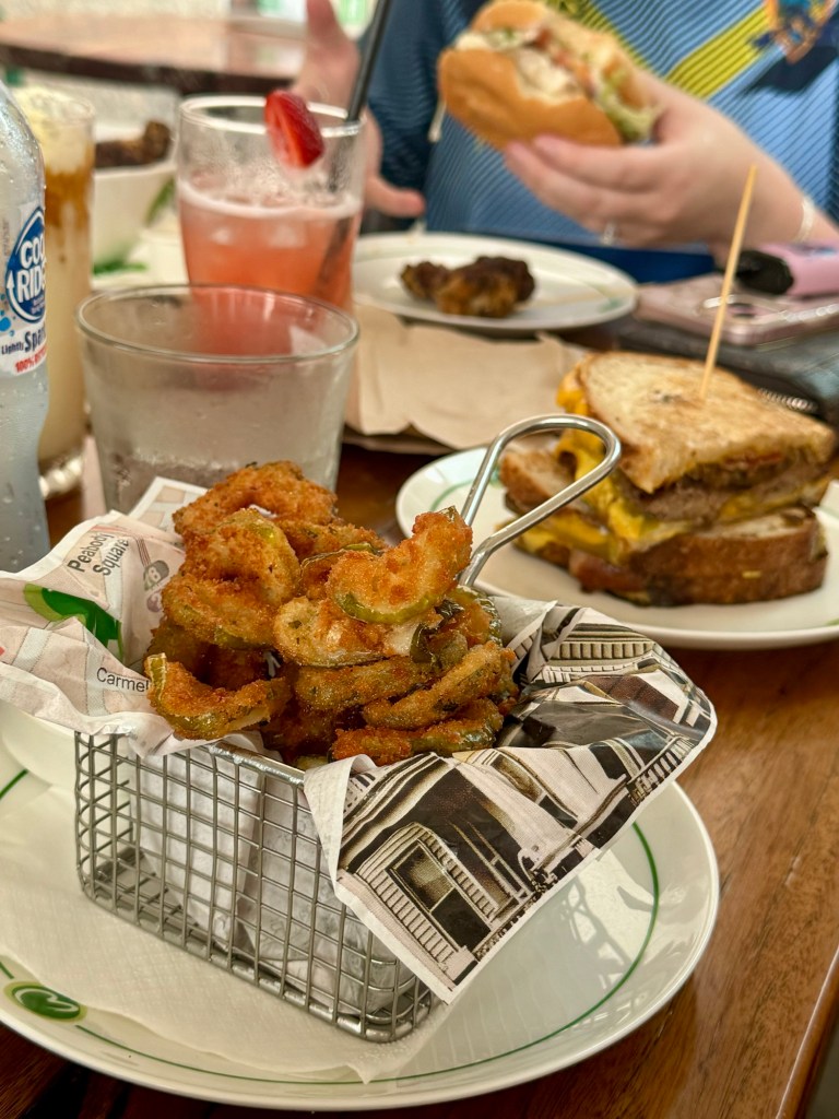 Dinner impressed us all- I enjoyed my Cobb salad, full of marinated gilled chicken, shaved Parmesan and blue- cheese dressing. Another standout was the crumbed, fried pickle slices-tangy/ salty crunched curls of deluciousness with a melted cheese dip