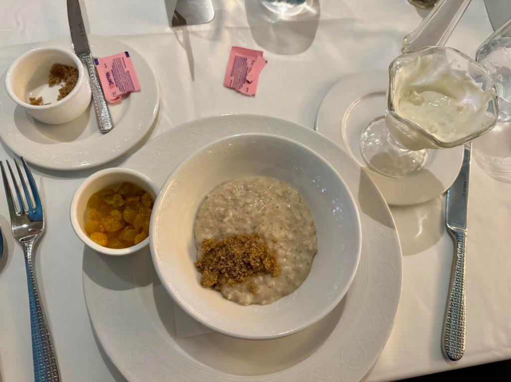 So I gobbled up my smoothie and fruit salad and bacon and coffee, and skedaddled to Tritons to meet the others. It is a sit-down service breakfast with much of the same menu as at Cabanas, a tad more refined. I saw cream-of-wheat actually listed on the menu. I flagged it with our server, but when he tried to see if they actually had any, it turned out they only serve porridge. *sigh*.