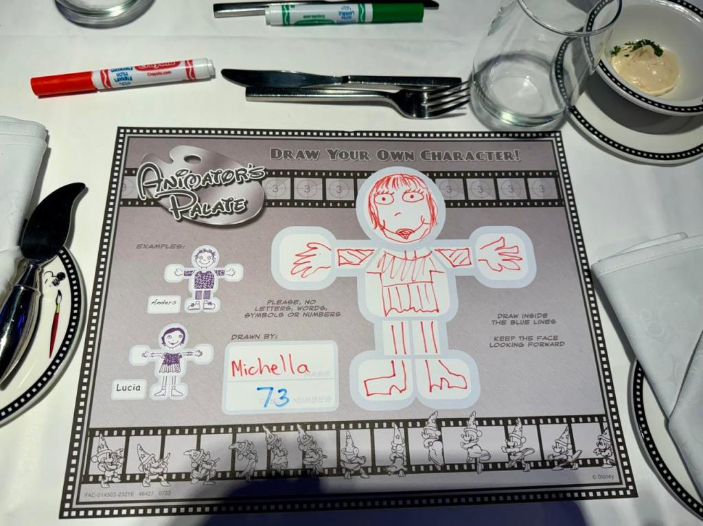 At our last dinner at Animator’s Palate, paper placemats and coloured markers greeted us.