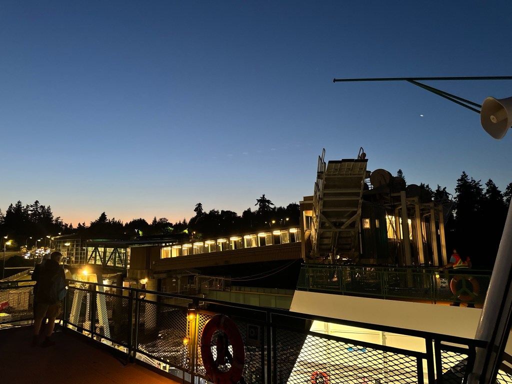 The ferry glider through the twilight toward Bainbridge where Moira was as airing to pick me up!