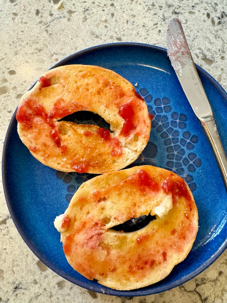 My first bagel fort 2024 and some cinnamon tea.